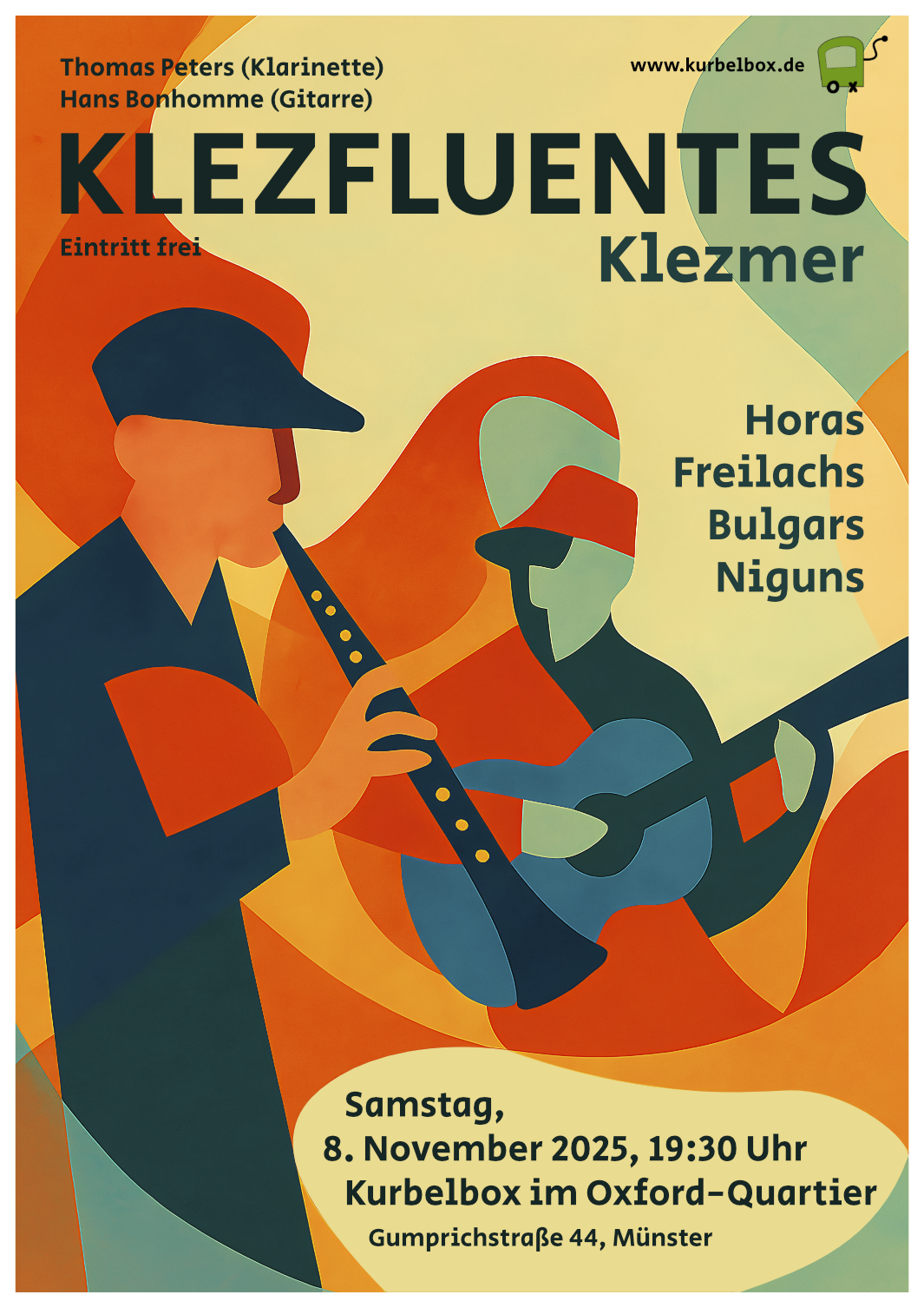 Thomas Peters an Klarinette und Saxophon und Hans Bonhomme an der Gypsy-Gitarre spielen in minimalistischer Besetzung jüdische Musik.